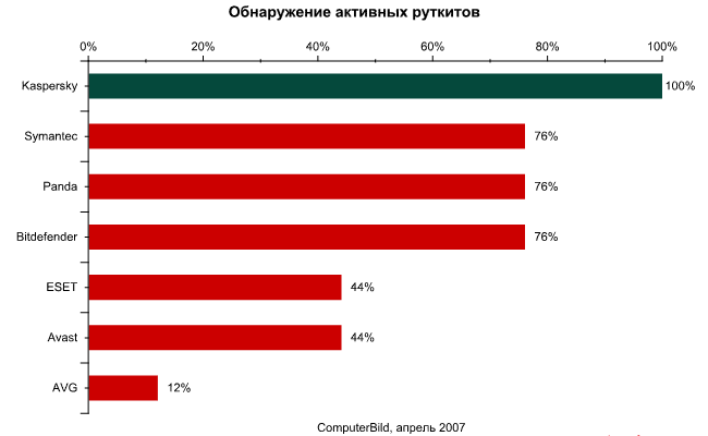 Руткит-технологии, приобретающие сегодня все большую популярность у вирусописателей, позволяют скрывать действия вредоносной программы и ее компонентов от пользователя ПК и антивирусных программ. Возможность обнаруживать в системе действия активных руткитов, проверять скрытые файлы и процессы является важной составляющей антивирусной защиты. В ходе тестирования, проведенного авторитетным немецким изданием ComputerBild, способность обнаруживать действия руткитов стала одним из критериев оценки антивирусных решений. В этом тесте Антивирус Касперского показал самый высокий результат.