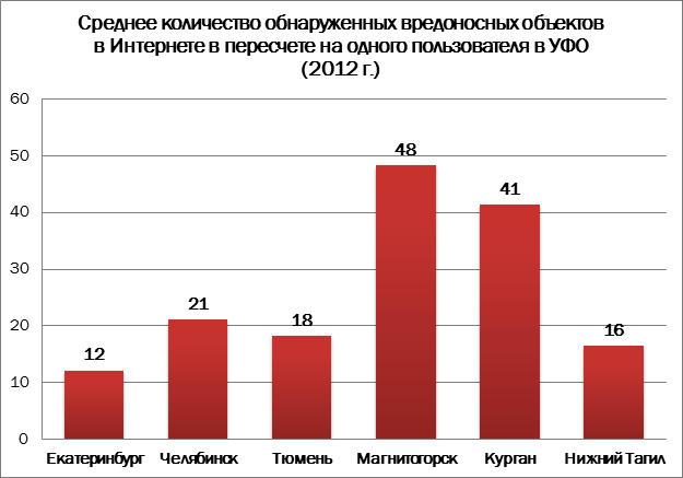 Помимо угроз в Интернете компьютеры пользователей в российских регионах нередко подвергаются риску заражения через различные переносные записывающие устройства, такие как жесткий диск или флэш-накопители. Чаще всего с этой опасностью в рассматриваемых федеральных округах сталкиваются жители Уфы, где на одного пользователя по итогам 2012 года в среднем приходится до 14 вредоносных объектов на локальном ПК.