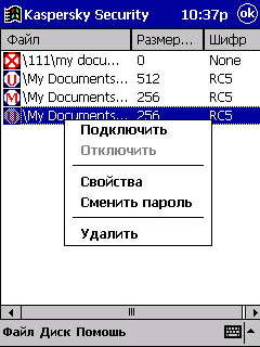 В Kaspersky Security для PDA также реализована надежная защита от несанкционированного доступа к информации, осуществляемая на основе системы паролей с использованием мощной криптографической функции MD-5 HASH. Кроме того, Kaspersky Security для PDA позволяет осуществить шифрацию любого типа данных, хранимых на PDA и картах расширения. Шифрование осуществляется "на лету": программа зашифровывает данные в момент сохранения и расшифровывает при каждом обращении к ним. Таким образом, вся информация в памяти КПК содержится только в зашифрованном виде, что предотвращает возможность хищения путем обхода системы паролей. На КПК, работающих под управлением Windows CE, предусмотрена возможность создания специальных папок, содержимое которых также шифруется "на лету" с использованием алгоритмов RC5 и RC6. Доступ к таким папкам разграничивается с помощью системы паролей.