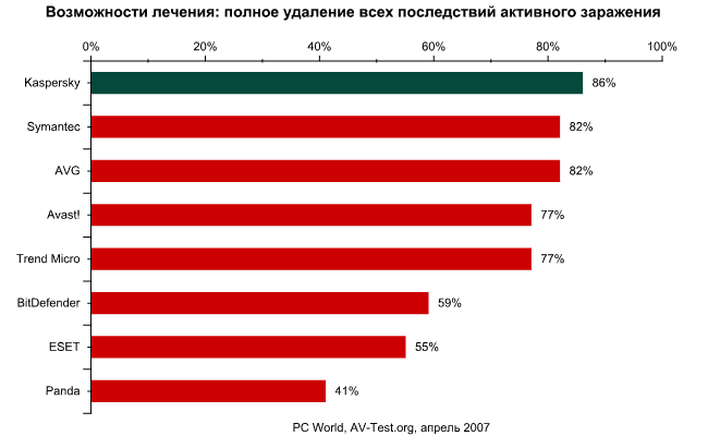 Американский журнал PC World совместно с исследовательской лабораторией при Магдебургском университете (AV-Test.org) провел в апреле 2007 года тестирование антивирусов, в ходе которого изучались способности популярных антивирусных программ лечить активное заражение, когда вредоносная программа уже запущена и установлена на компьютере и даже может препятствовать тому, чтобы ее обнаружил и удалил антивирус.