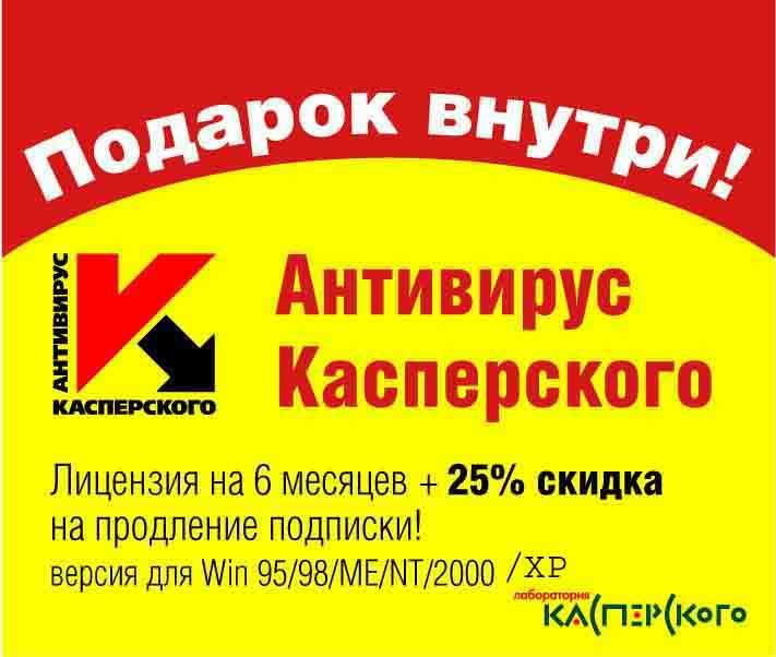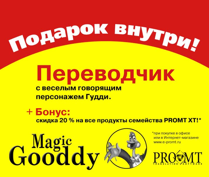 Покупатели Антивируса Касперского Personal Pro найдут внутри коробки с такой наклейкой мультимедийный говорящий переводчик Magic Gooddy 2000 и купон на приобретение продукции компании ПРОМТ с 20% скидкой*.