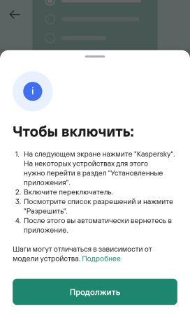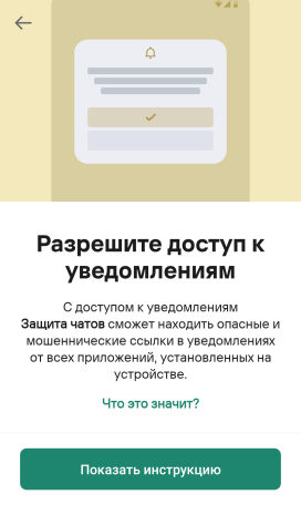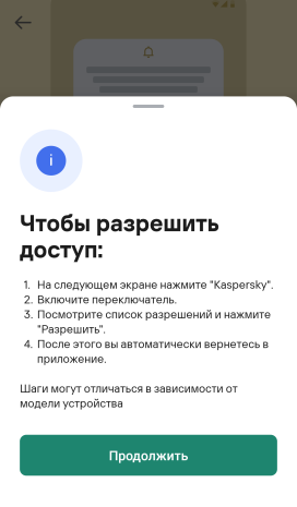 Последовательность действий может незначительно отличаться в зависимости от модели смартфона, поэтому всем пользователям Kaspersky для Android доступен быстрый переход из приложения в необходимый раздел настроек: в приложении нажмите на Проверять уведомления, а в открывшемся окне кликните на Показать инструкцию → Продолжить.
