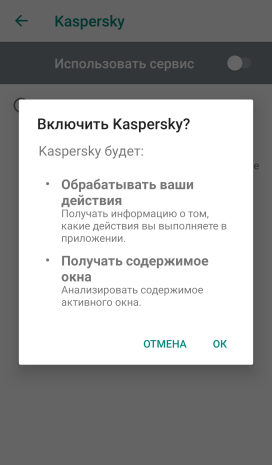 Для того чтобы Kaspersky для Android мог обнаруживать угрозы и реагировать на них, нужно дать приложению необходимые разрешения на уровне операционной системы Android. В первую очередь включаем доступ к специальным возможностям — он потребуется для всех уровней защиты. Если разрешение на доступ к специальным возможностям не предоставлено, то наше приложение предупредит вас об этом и покажет инструкцию. Вы также можете открыть доступ в настройках смартфона самостоятельно: Настройки → Спец. возможности → Kaspersky → Использовать сервис → ОК.