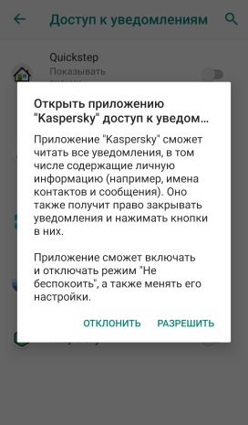 - Разрешите доступ к уведомлениям: Настройки → Приложения и уведомления → Специальный доступ → Доступ к уведомлениям → Kaspersky → Разрешить.